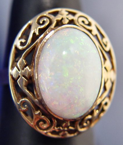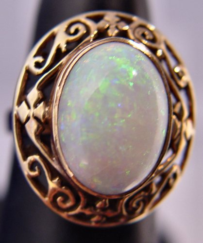 CABOCHON OPAL RING: Lovely oval opal with great color variation measuring approx. 11 x 15 x 5mm, bezel set in a filigree mounting of 18k yellow gold, size 5.75, 5.4 grams.
