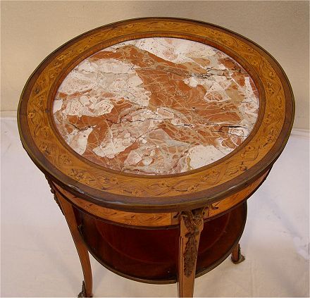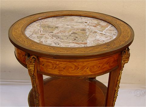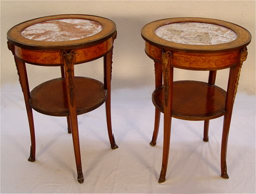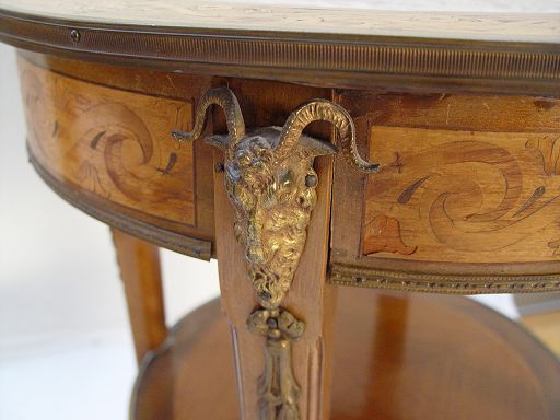 PAIR OF FRENCH MARBLE TOP AND MARQUETRY SIDE TABLES: Pink marble tops framed in ring of marquetry inlay. Ormolu rams head masquerons adorn the legs. 31''h. x 21 1/4''.