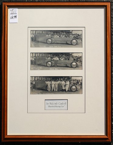 BLUEBIRD RACING CAR PHOTOS AUTOGRAPHED BY SIR MALCOM CAMPBELL: Three photos in a framed presentation, one is autographed by Malcom Campbell. The photos were taken in Daytona Beach Fl, 1932. They are labeled Coursen #1, 2 and 3. 24'' x20' overall. t
