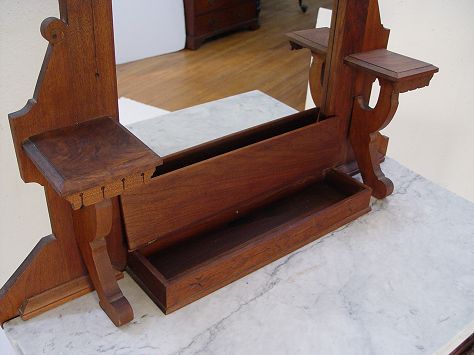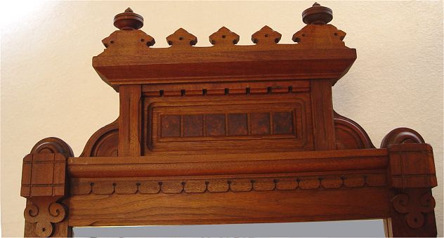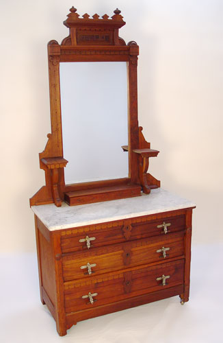 VICTORIAN MARBLE TOP DRESSER WITH MIRROR: Walnut with beveled white marble top (worn corner), incised carving and finials across the pediment, three drawers have unusual shaped pulls. 86''h. x 42''w. x 21''.