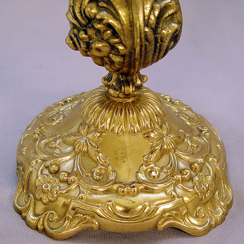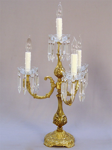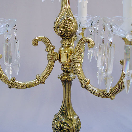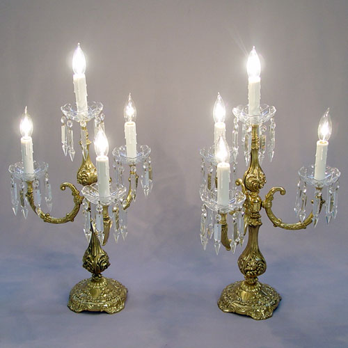 PAIR OF HIGHLY DECORATIVE 4 LIGHT CANDELABRUM: Custom crafted brass and crystal, 25''h., 15''dia.