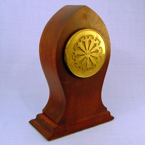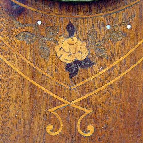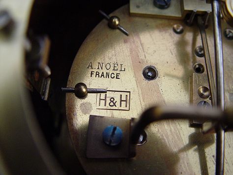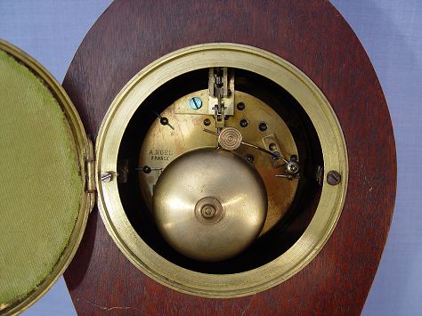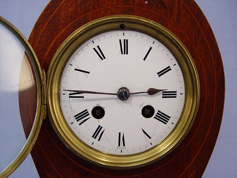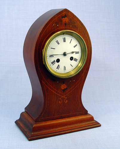 MAHOGANY INLAY FRENCH CLOCK: Inlay case, 4 1/4'' enamel dial with Roman numerals. Brass works are marked A.Noel France H & H. 12''h. x 8 1/4'' x 3 3/8''.
