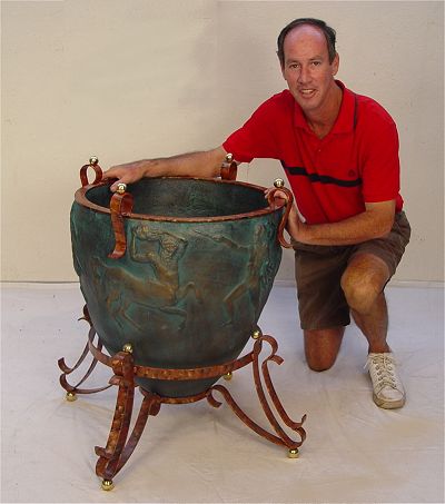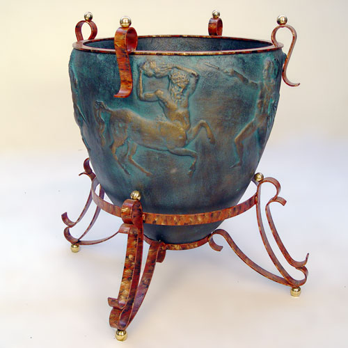 MAITLAND SMITH GREEK MYTHOLOGY IRON JARDINIERE ON STAND: Embossed freeze of Greek characters decorate the exterior. Cast and wrought iron. 32''h. 26'' dia.