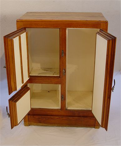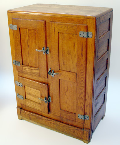 GOLDEN OAK VINTAGE OAK ICE BOX: Three door with white painted tin interior. 42'' x 30'' x17''.