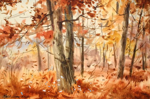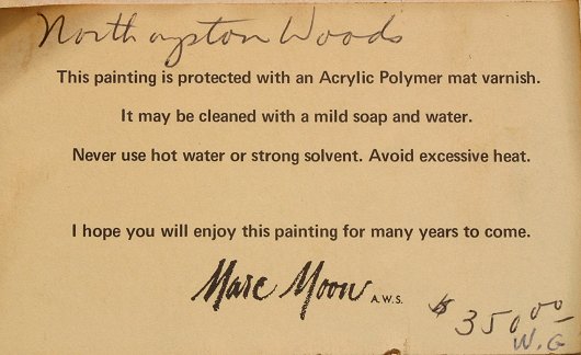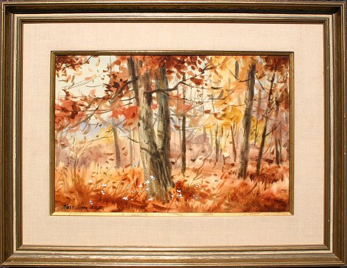 MOON, Marc, (American, 1923-2006): Autumn Landscape in Northampton Woods, W/C, 15'' x 22'', signed, framed, 24'' x 32'', coated with protective acrylic polymer by the artist, titled verso. He is a member of the Salmagundi Club, the Hudson Valley Artists, and the Society for Painting in Casein.
