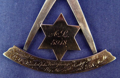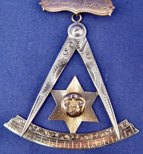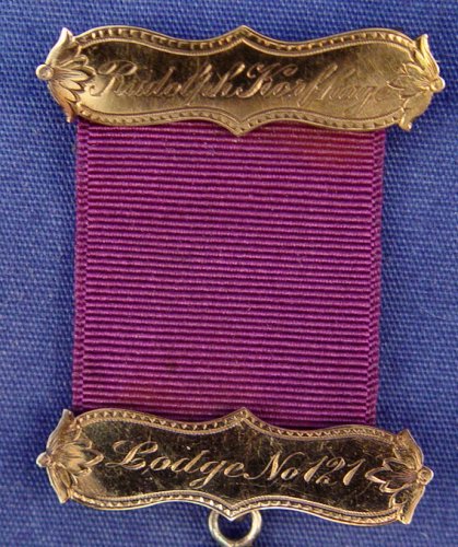14K GOLD AND STERLING MASONIC BADGE: 14k yellow gold bars and purple ribbon support the gold and sterling compass and quadrant enclosing a radiant sun of gold. This once belonging to Past Master Rudolph Korfhage, dedicated and presented by Mozart Lodge No 121. It has descended through the family and is sold with the original storage case.