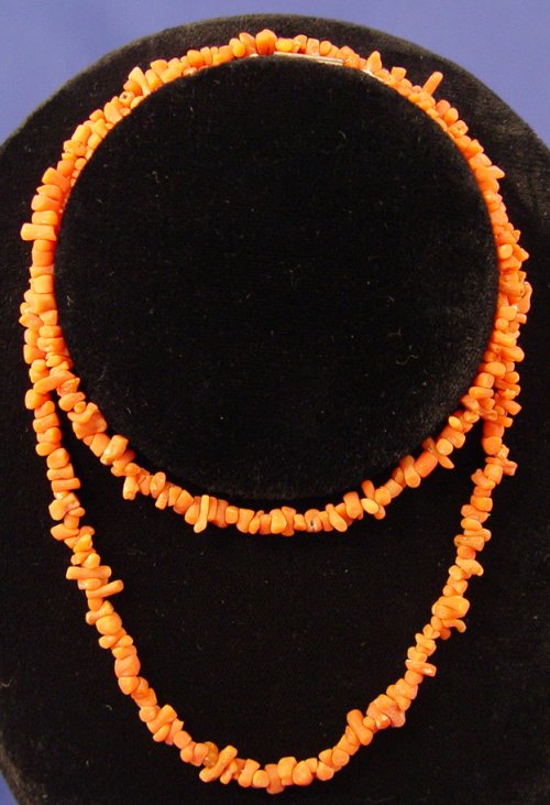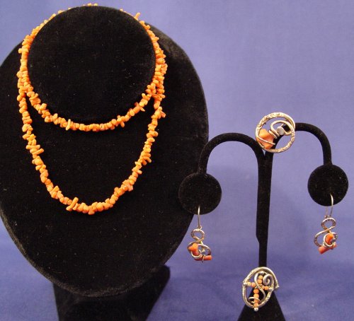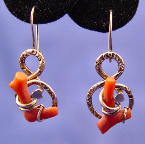 VICTORIAN CORAL JEWELRY: To include, 22'' nugget necklace with gold clasp monogrammed ALG, pair of dangle earrings of 10k gold, and two circle pins - a 12k set with a cross and a 14k set with a nugget. Gold karat by approximated by acid test. Sold as a lot.