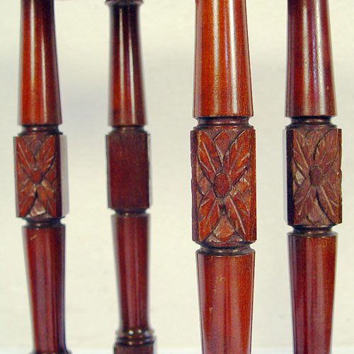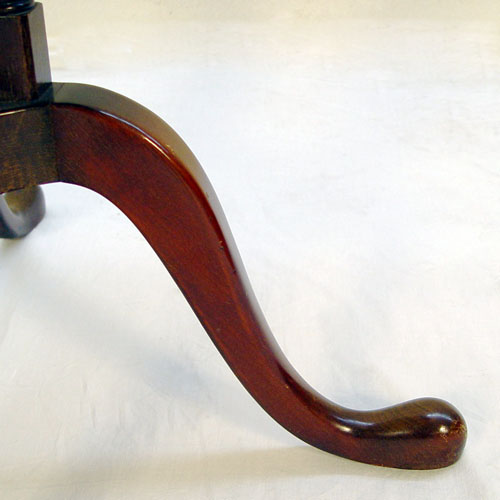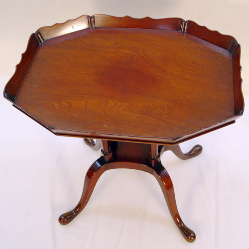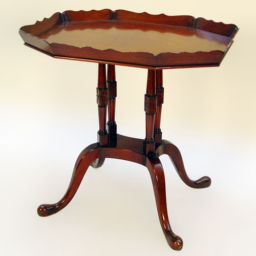 MAHOGANY TEA TABLE: Tray like top with shaped gallery, 4 turned pedestal legs join Queen Anne legs ending in snake feet. 28''h. x 29'' x 22''.