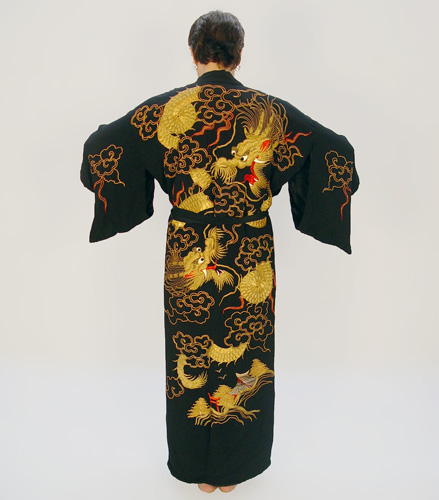 VINTAGE 1920'S JAPANESE GOLD METALLIC THREADED KIMONO: Dragon embroidered in gold metallic threading on rayon. 56'' long, the sleeves hang 14''.