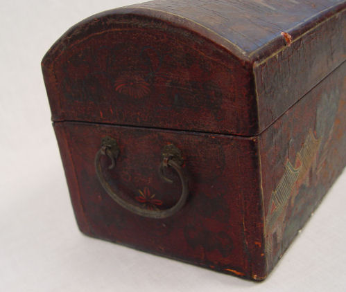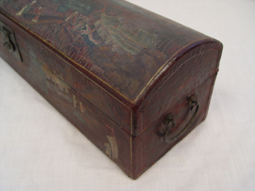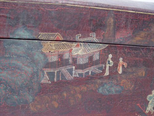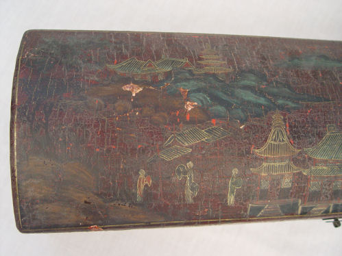 19th C CHINESE LACQUER PILLOW BOX: Once used for valuables in the honorable families. Lacquer box is decorated throughout, bale handles on the sides, paper lined interior. Stamped ''China'' verso. The lacquer is worn and shows its age. 7 1/2''h. 25''long, x 7''.