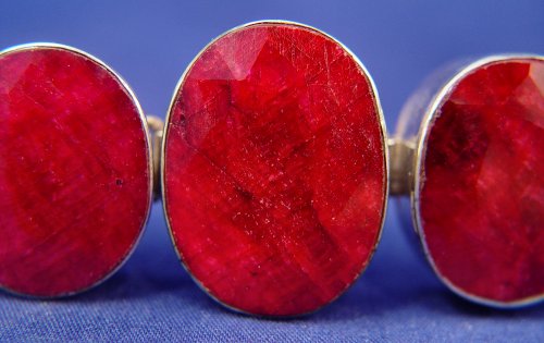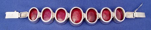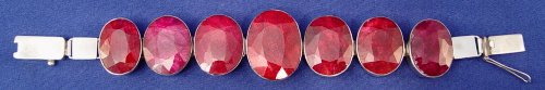 245ctw RUBY AND STERLING BRACELET: Seven oval shaped rubies weighing approx. 25 to 45 carats bezel set in deep sterling links, 8.5'', 74.9 grams. Sold with current Tampa Gemological Laboratory appraisal, $2600 estimated replacement value.