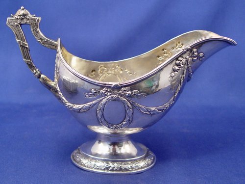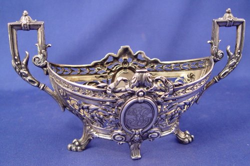 ESTATE LOT OF GERMAN 800 SILVER: Five pieces to include, reticulated stand marked Friedlaender, please note no insert, stylized monogram to one side, overall 8 1/2'' x 4 x 5 1/4''h; gravy boat with an embossed wreath and ribbon design, overall 8 1/4'' x 3 1/2'' x 5 3/4''h.; fluted rim bowl, marked with a goblet - possibly Otto Wolter Silberwarenfabrik, 8 1/2''dia. x 2 3/4''h.; matching fluted compote on pedestal base with matching mark, 6 1/2''dia. x 2 1/4''h.; small square dish by Gebruder Kuhne, 4 1/4'' x 7/8''h.