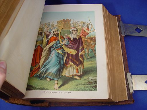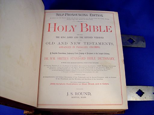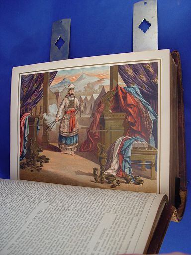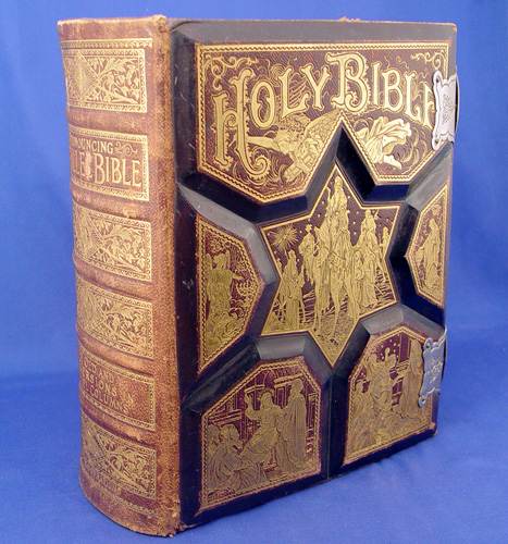 1891 LEATHER BOUND HOLY BIBLE: With 2000 ''scripture illustrations in steel, wood and color''. JS Round, Boston Mass, 1891. Gilt leather with wide metal clasps. 12 1/4'' x 5 1/4'' x 10''.