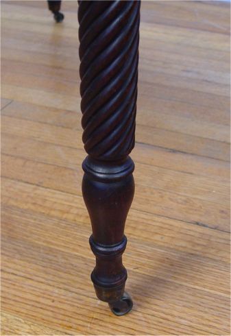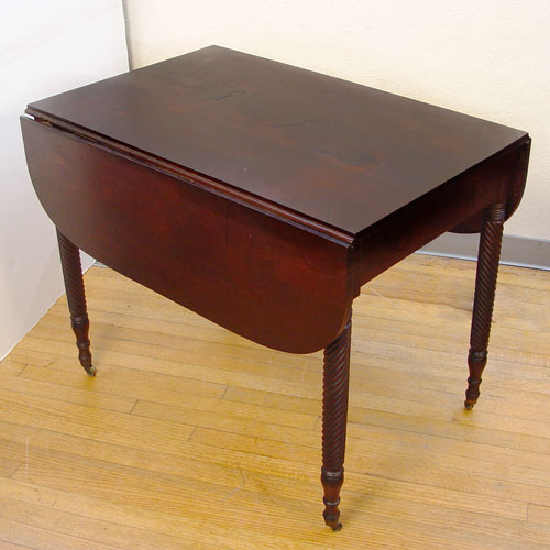 EARLY SPIRAL CARVED MAHOGANY DROP LEAF TABLE: Solid mahogany table with single board center, spiral carved legs. These are not swing or gate legs. 29''h. x 23''w. x 36'' Opens to 46'' with leaves extended. The leg span is 18''
