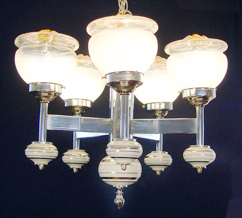 RESTORED MID CENTURY RETRO CHANDELIER: Chrome and porcelain frame with opaque art glass shades.