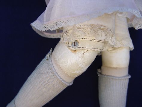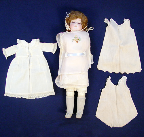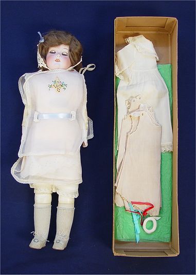 ARMAND MARSEILLE SUNSHINE KID PORCELAIN DOLL 370 IN ORIGINAL BOX: Porcelain head doll with the back of head marked ''Germany / 370 / A 3 M . Brown sleepy eyes, open mouth with teeth. Kid leather body with jointed knees and shoulders. Sunshine Kid label on the doll and the box. The box is 25 1/2''l x 5 1/4'' x 6 1/2''. The doll is 22'' long. Sold with extra clothes.