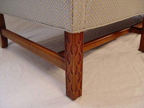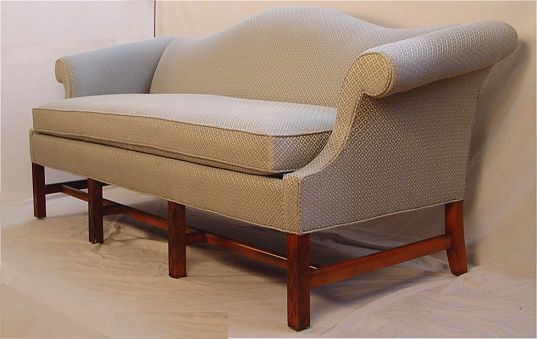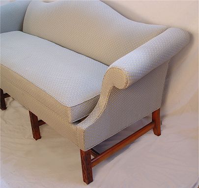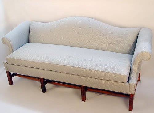 CRAFTWORK GUILD CHIPPENDALE STYLE CAMEL BACK SOFA: Chinese Chippendale legs, single cushion seat. Manufactured by the Craftwork Guild of Hickory NC. 10'' long, x 33''h. x 33''.