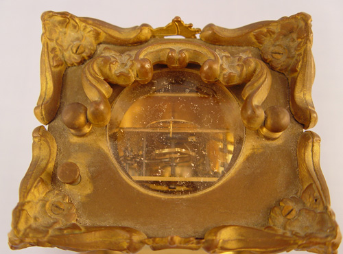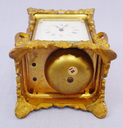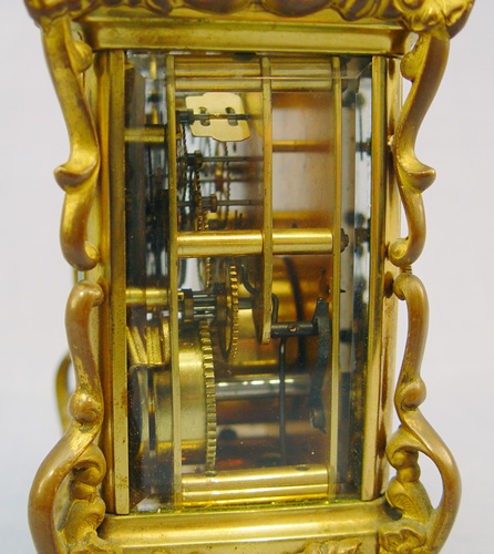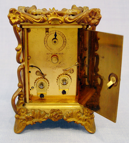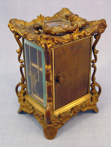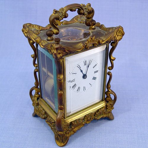 WATERBURY REPEATER CARRIAGE CLOCK: Ornate brass case with beveled glass on four sides, brass door on back. Bale handle, replaced crystal on top. 5 1/4'' x 3'' x 3''. Due to their delicate nature we cannot guarantee clocks to work upon arrival.