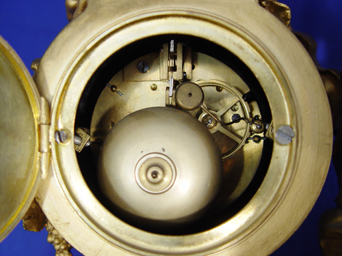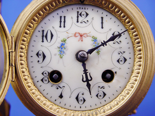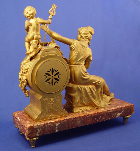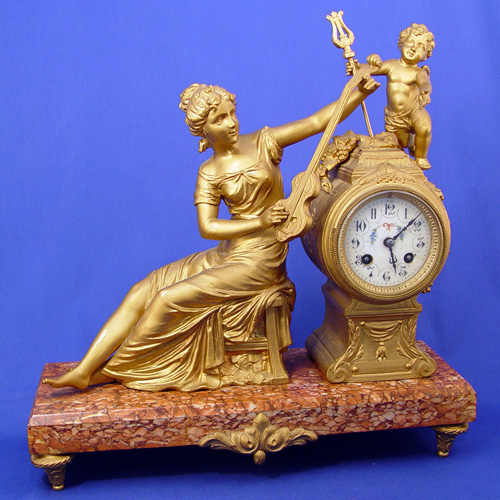 FRENCH MARBLE BASE CLOCK WITH MAIDEN & CHERUB: Harmonie and cherub, gold painted finish on the figures. Marble base on feet. 3'' dia, 15'' x 15 1/2'' x 5 1/2'' overall. Due to their delicate nature we cannot guarantee clocks to be working upon arrival.