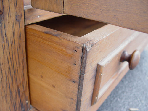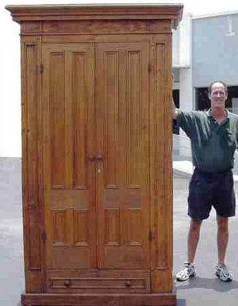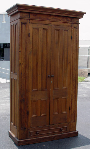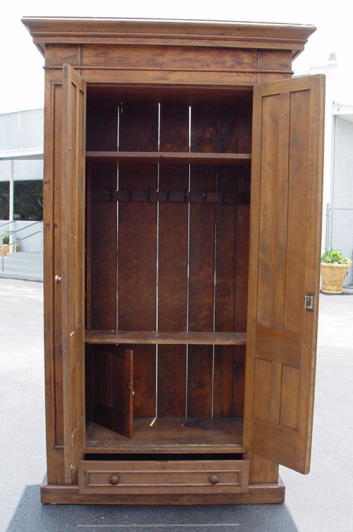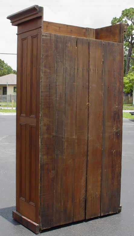 FABULOUS 8 FT TALL 19TH C PINE WARDROBE CABINET: Two door cabinet, the interior fitted with hooks under a full length shelf. An unusual feature is the series of shelves down the inside left along with a small lock space with door. 8' tall x 32 1/4'' x 10 3/4'' overall including the overhanging molding.