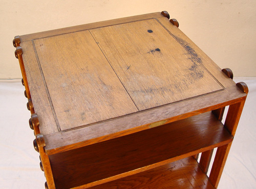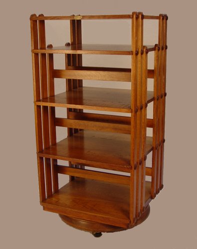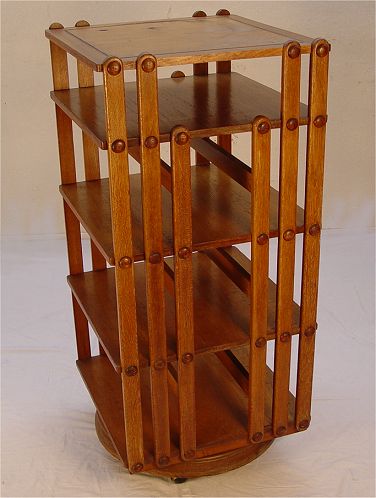 OAK REVOLVING BOOKCASE CABINET: Sargent Mfg.Co. brass label. Holds file folders, periodicals or books. 48 1/2'' h. x 22 1/4'' x 22 1/2''. Newer casters, original finish.