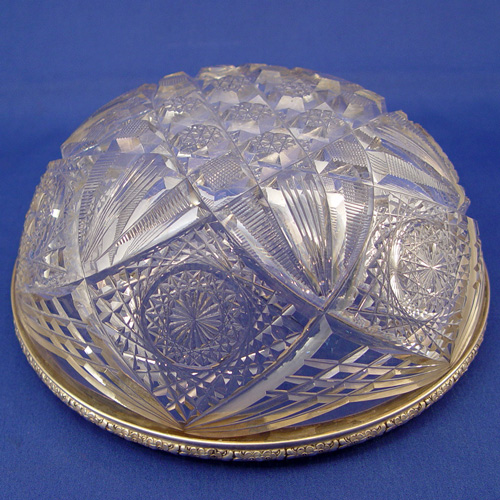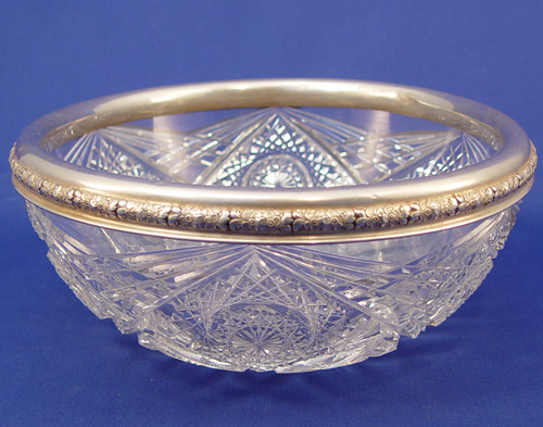 GORHAM STERLING RIMMED BRILLIANT CUT GLASS BOWL: Floral embossed sterling rim, signed with the anchor logo. 3 3/4'' h, 9 1/4'' dia.