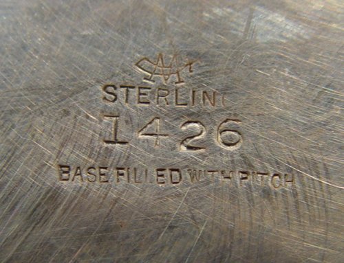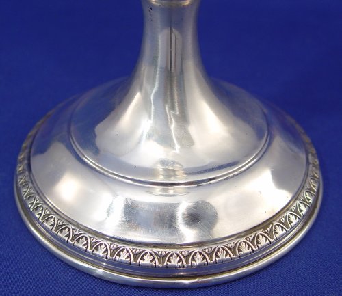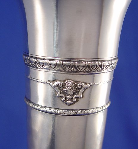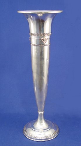 MATTHEWS STERLING TRUMPET VASE: Rolled rim, embossed decorative frieze. Please note several small dents. Weighted base. 16''H.