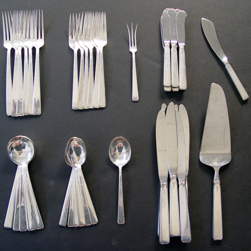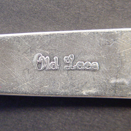 TOWLE STERLING FLATWARE SERVICE IN THE ''OLD LACE'' PATTERN: 39 piece Service for six to include 6 dinner forks 7 1/4'', 6 salad forks 6 5/8'', 6 soup spoons 6 3/8'', 6 teaspoons 6'', 6 dinner knives with stainless blades 9'', 1 master butter and 6 individual butter knives, one lemon fork and a sugar shell. No monogram, sold in a wooden box with JRS dedication plaque. Est. $800/1200**