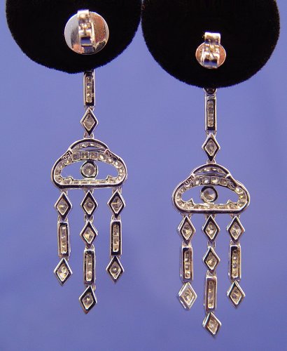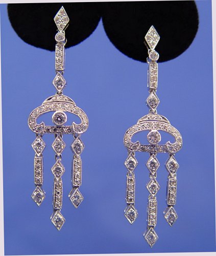 1.43ctw DIAMOND CHANDELIER EARRINGS: Delicate dangling diamond earrings set in 18k white gold, post backs, 1/2'' at widest, 1 7/8''l., 8.3 grams. Est. $2500/3500**