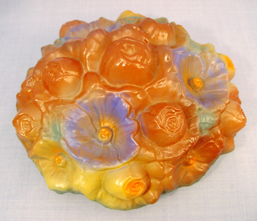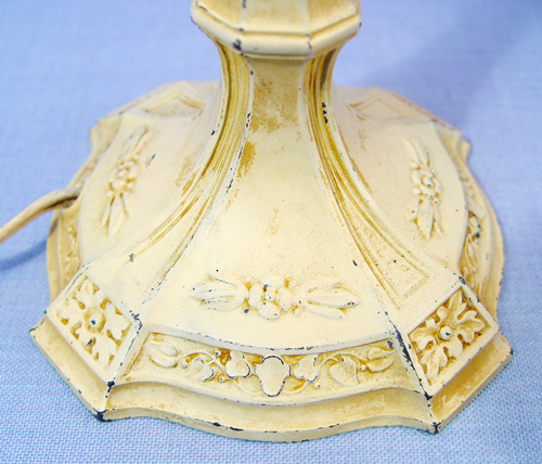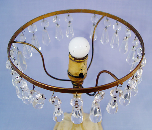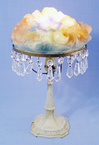 VINTAGE PUFFY SHADE BOUDOIR LAMP: Original painted finish on the metal base, original flashed color on the glass shade. Crystal prisms along the rim. The shade is 8''dia., the lamp is 15''h.