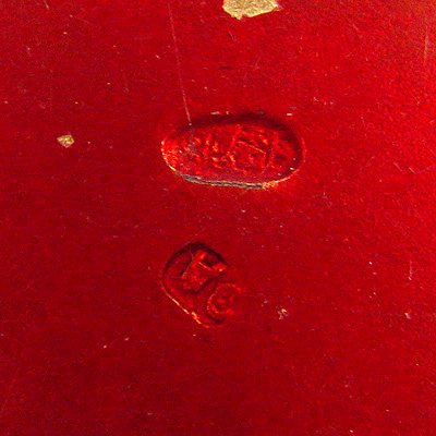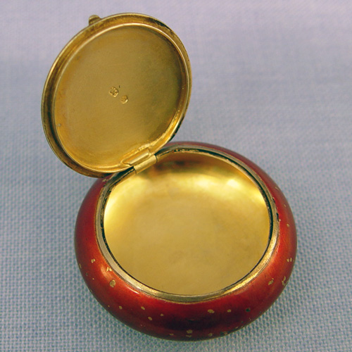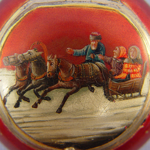 RUSSIAN RED LACQUER SILVER PATCH BOX: Moscow region, 1896-1908, silver content 84. troika scene on the cover, vermeil interior and vermeil showing through the several knicks in lacquer. 2 7/8'' dia.