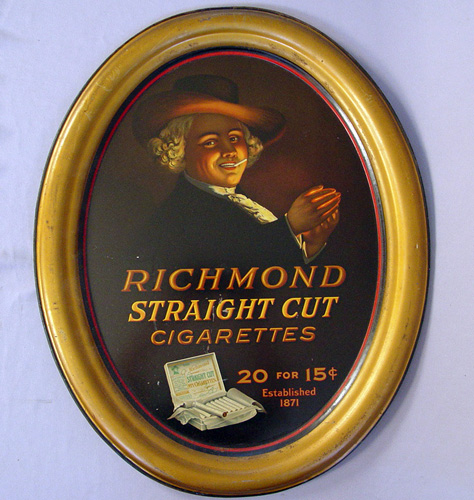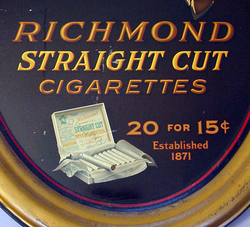 VINTAGE RICHMOND CIGARETTE ADVERTISING TRAY: Large oval tray advertising Richmond straight cut cigarettes, 20 for 15 cents. 28'' x 22 1/2''.