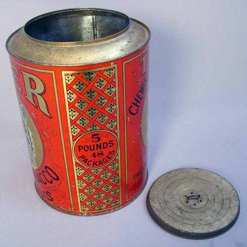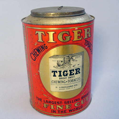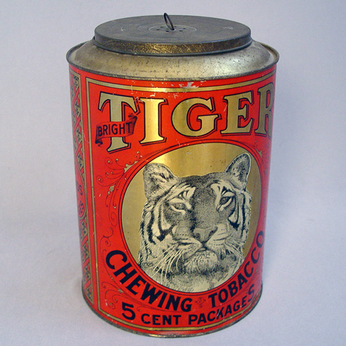 VINTAGE RED TIGER 5 CENT CHEWING TOBACCO TIN: Tiger graphic on red ground. Originally held 5 lb. in 48 packages. 12'' h. x 13'' x 10 1/2''.