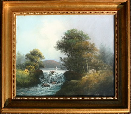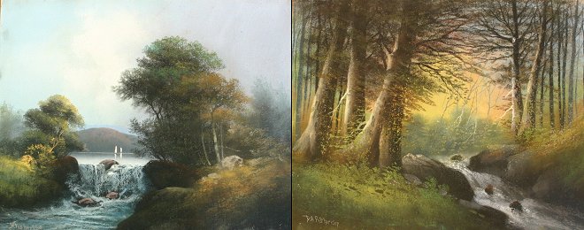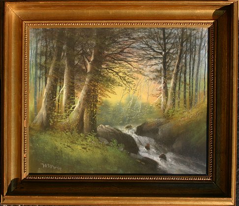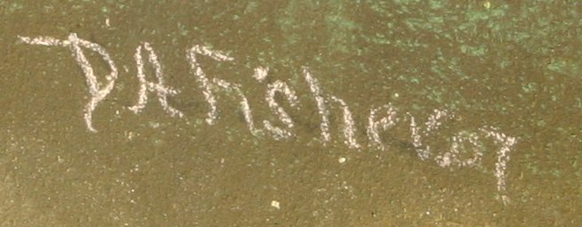 FISHER, D.A., (American, 19/20th C.): Pair of Pastel Landscapes, one depicting a lake scene with boats, and the other a forest brook at sunset, 16'' x 20'', both signed and dated 1907, matching gilt frames, 21'' x 25''. Fisher worked in Maine mostly, and although not an official member, Fisher reportedly associated with ''The Brushian's'', and artist group in Maine.