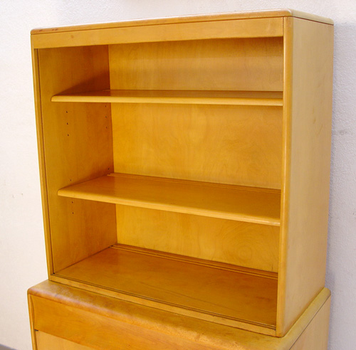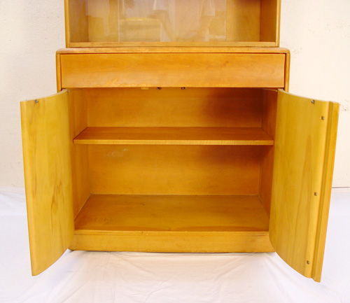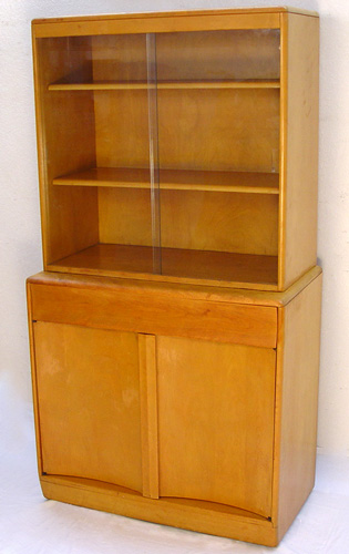 HEYWOOD WAKEFIELD CHINA CABINET: Designed by W. Joseph Carr. Two piece china cabinet on server. M175 on M94, on swivel wheels. Top with adjustable shelves and glass sliding doors. Lower section with full length drawer. 64''h. x 34'' x 18''. Original finish in slightly worn condition, structurally very sound.
