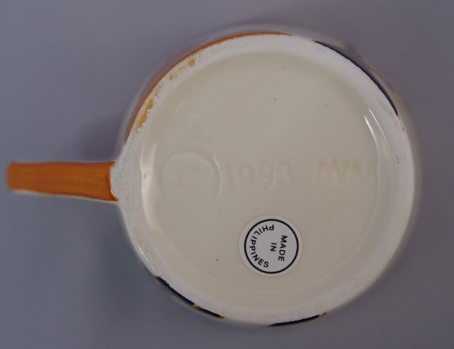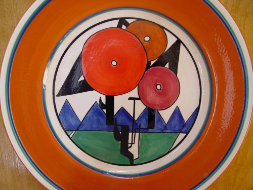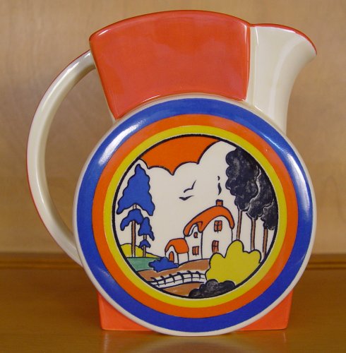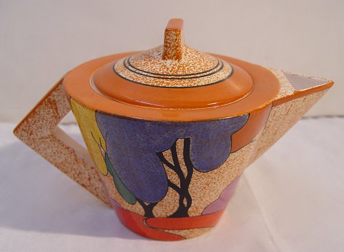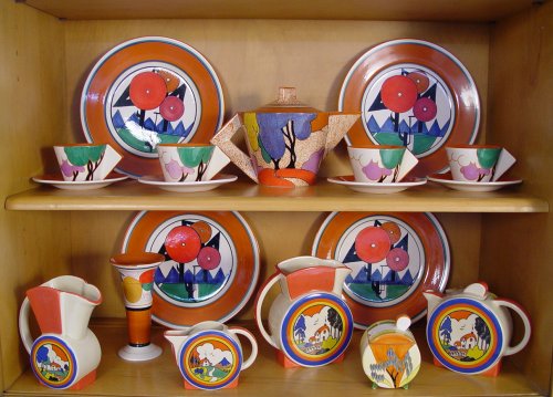 CLARICE CLIFF DESIGNED DINNERWARE: Faithful reproductions from the Metropolitan Museum of Art. From the MMA dated 1993 are 4 dinner plates, 4 cups and 4 saucers, a conical teapot, vase, and sugar bowl. Sold with Moreland Chelsea Works teapot, creamer, sugar and a pair of 6 1/2'' pitchers. 20 pieces total.