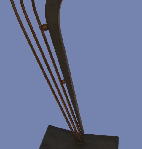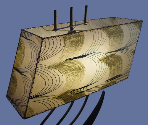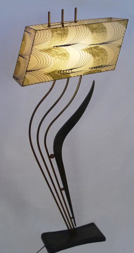 1950'S MODERNE FLOOR LAMP BY MAJESTIC MFG CO: Boomerang base of brass and wood, original fiberglass shade, paper label to underside of wood base, age related wear and discoloration to brass and wood, shade in good condition except for some wear to top lacing. Approx. 66''h. overall.