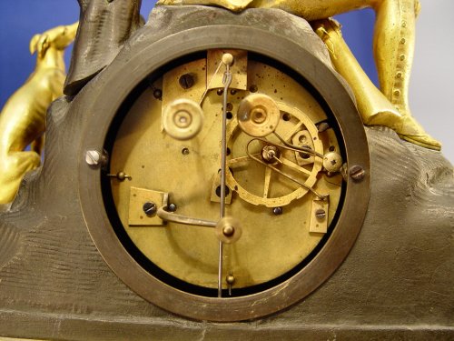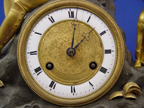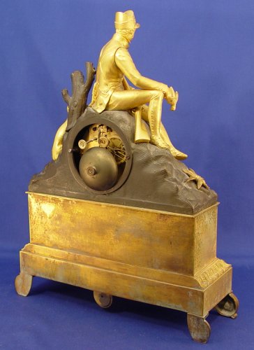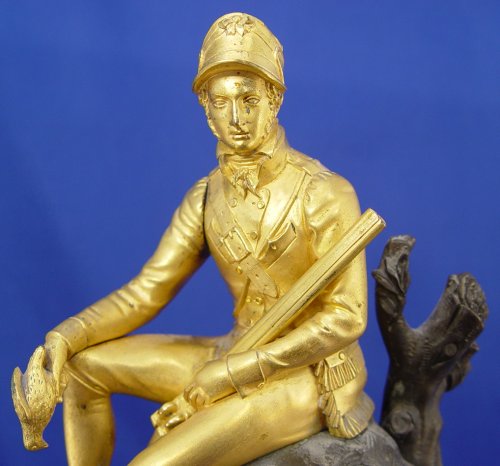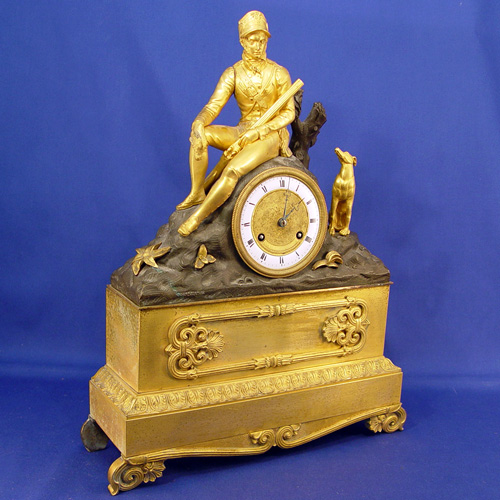 FRENCH FIGURAL CLOCK CALVARY MAN AND DOG: Clock surmounted by a French soldier resting with his dog. Original gilt finish. Bell strike, pendulum included. Due to their delicate nature we do not guarantee clocks to be working upon arrival.
