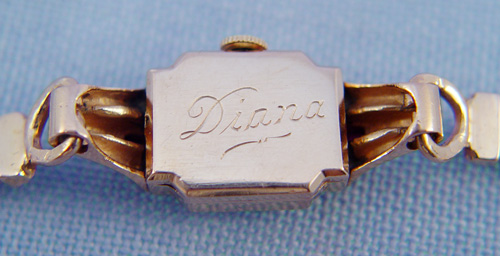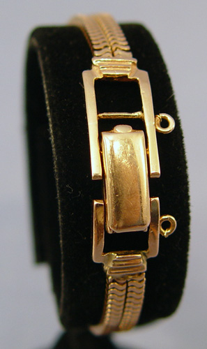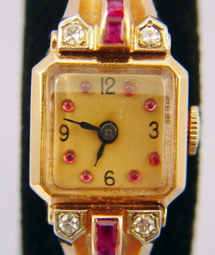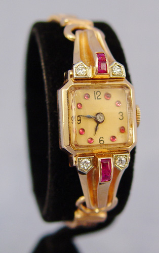 LADY'S HEBE ROSE GOLD DIAMOND & RUBY DRESS WATCH: Deco rose gold watch set with four tiny diamonds approx. 10pts total and four square cut rubies, 17 jewel unadjusted manual wind works marked Hebe, inside back marked 14k 7782, clasp on double mesh bracelet marked 14k, cabochon rubies as some of the hour marks, approx. 6 1/4''l., 16 grams. All clocks and watches are sold as not working, due to their delicate nature, even though they may be just fine.