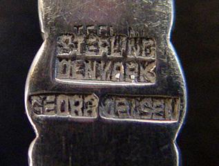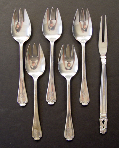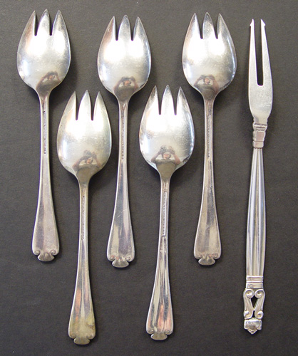 TIFFANY & GEORG JENSEN STERLING: 5 Tiffany & Co ''Flemish'' ice cream forks, 5 1/4''l., monogrammed RAC. Sold with a Georg Jensen butter of cocktail fork in the ''Acorn'' pattern, 6 3/8''l.