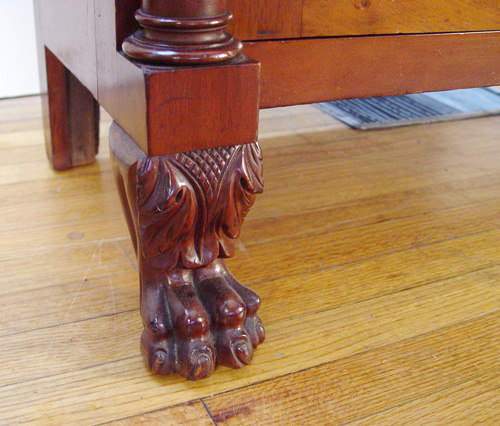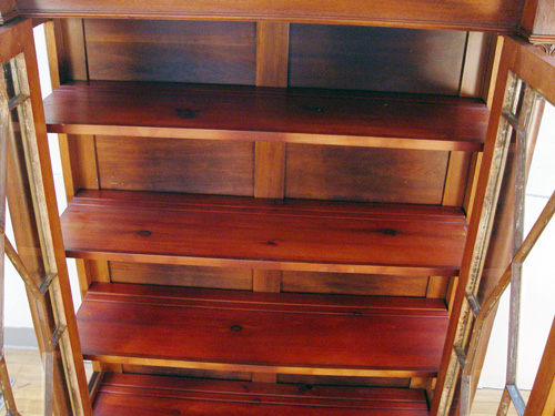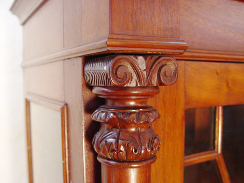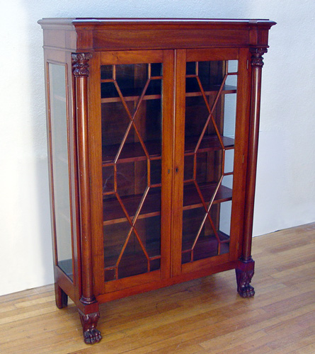 EMPIRE FEDERAL MAHOGANY 2 DOOR BOOKCASE CHINA CABINET: Carved columns, double glass front doors with individual glazed lattice, scrolled feet. Shelves have plate grooves. 60'' x 43'' x 18''.