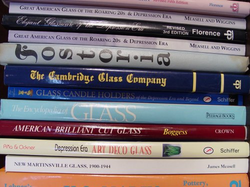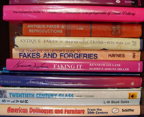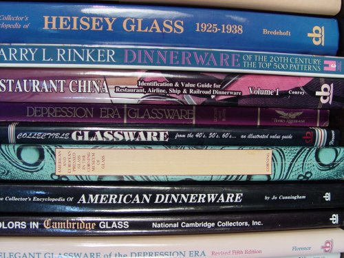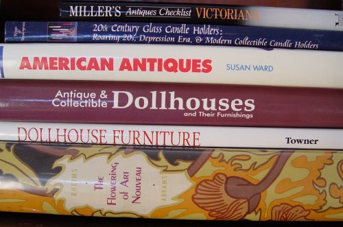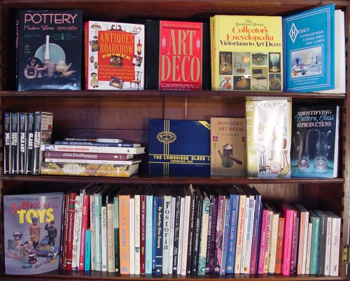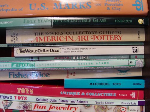78 ANTIQUE & COLLECTIBLE REFERENCE BOOKS: Large collection of barely used reference books on antiques. Heisey, Cambridge, Fostoria, Depression, glass. Art pottery, dinnerware, restaurant china, toys, dolls, miniatures, Art Nouveau, Art Deco, silver, pewter, Roycroft, Millers and 5 Knopf Collectors' Guides, to many to list. Please call for info.