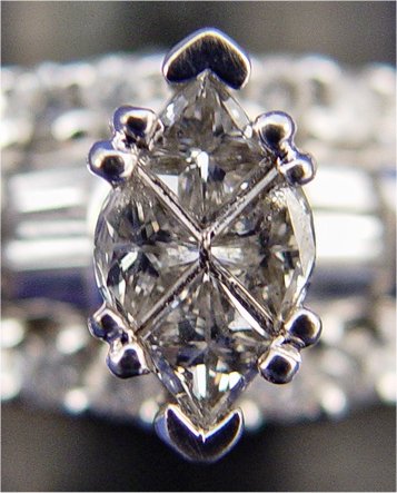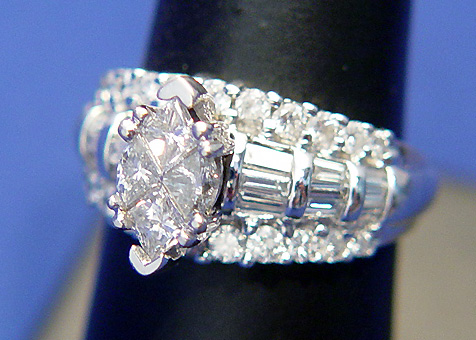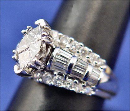 LADIES DIAMOND RING: Two tone mounting of 14k gold sparkles with round brilliant, baguette and fancy cut diamonds. Approx. 1.50ctw, four fancy cut center stones invisibly set in center and prong set on outer edges, small round brilliants prong and bead set and baguettes channel set. Size 7.25, 7.6 grams.