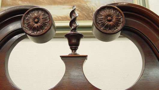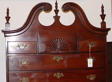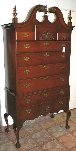 EDISON INSTITUTE MUSEUM REPRODUCTION HIGHBOY BY COLONIAL MFG.CO.: Tall mahogany chest featuring spiral finials, engraved hardware, shell carved drawer, ball and claw feet. Eleven drawers, five are full length. 77'' h., 39'' w., 20'' d.