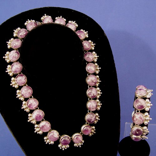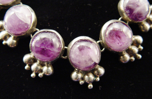 MEXICAN STERLING & AMETHYST NECKLACE & BRACELET: Wonderful set of hand crafted sterling made in Taxco Mexico by an unknown artist. 15 1/2'' necklace with each of the 25 links bezel set with it own 13mm amethyst cabochon, simple hook closure. Matching 6 3/4'' bracelet with 11 amethyst. Each link approx. 7/8'' x 9 /16''w. Both pieces marked Sterling Taxco.