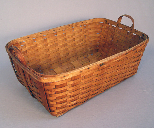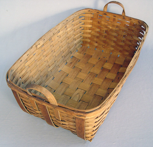 ST. REGIS MOHAWK NATIVE AMERICAN UTILITY BASKET: Purchased from the St. Regis Tribe in Hogansburg, New York during the 1930's. 10''h. x 29'' x 19'' plus loop handles. Very good condition with no breaks.