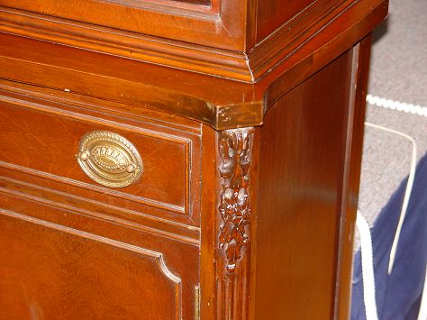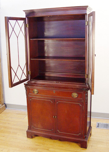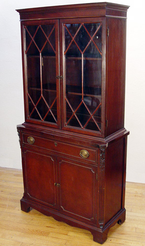 A DIMINUTIVE 1940'S FINE MAHOGANY CHINA CABINET: Glass front doors on the top, lower section with full length drawer over cabinet doors. 67 1/2'' x 33 1/4'' x 15 1/2''.