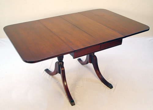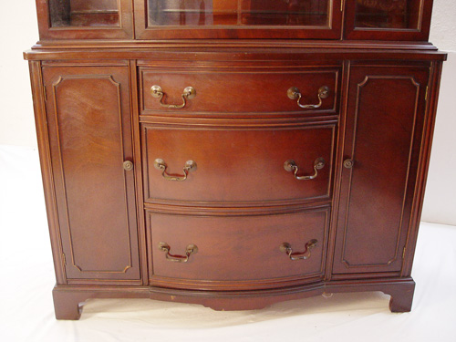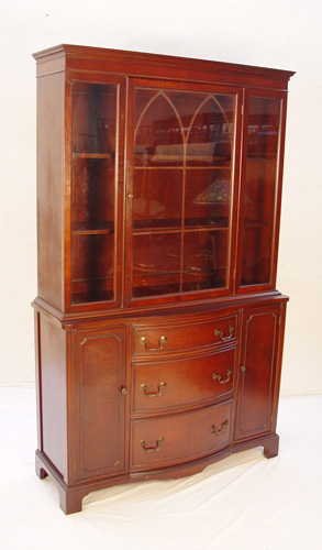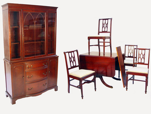 1940's TRADITIONAL MAHOGANY DINING SET: The set includes a China cabinet, drop leaf dining table, leaf and 4 pierced back chairs. The china cabinet has a bowed front at the lower section with center drawers, 73 1/2'' x 44 1/2'' x16''. The gothic arches in the cabinet are reflected in the backs of the chairs. The table is 25'' x 38'' with leaves down, 29''h. x 60'' long x 38'' with leaves extended, add another 10'' with the leaf. Lovely for a condo.