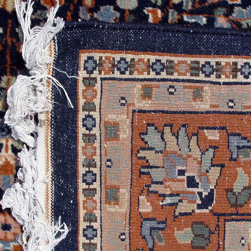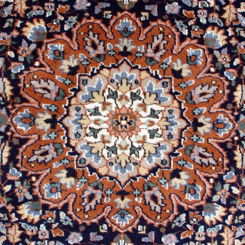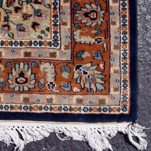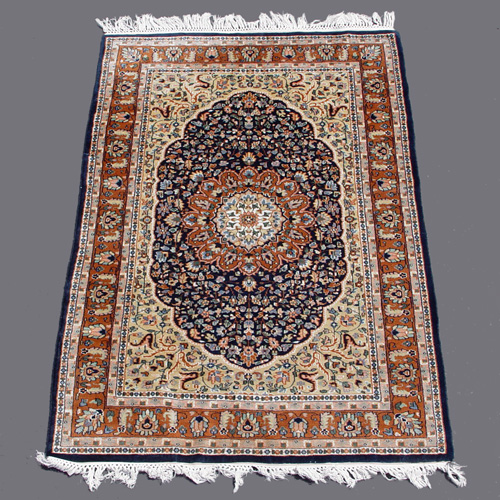 HAND TIED CARPET IN EARTHY TANS AND BLUE: Approx. 4 x 6'' with central medallion.