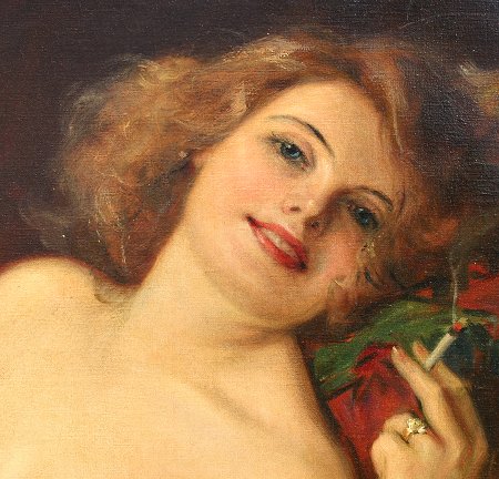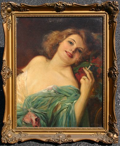 GEIGER, Richard, (Austrian, 1870-1945): Flirtatious Smoker, O/C, 19 1/2'' x 15 1/2'', period gilt frame with wear and missing gesso, signed. Several paint flecks, needs cleaning. Est. $800/1200**